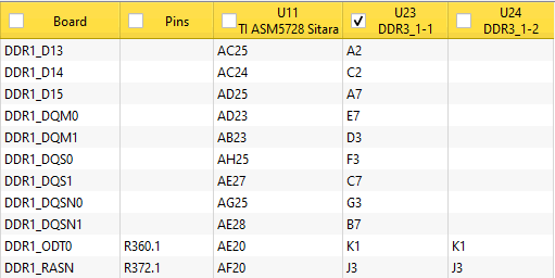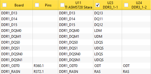 BoardTrace uses pin labels in the columns of the components when available in the PCB netlist format. The pin labels make it easier to verify connectivity. You can add any number of components to the view to easily see how they connect to each other. in the example below it easy to see that data lines D14 and D15 have incorrect connections.