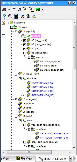 The Hierarchical View shows the hierarchy of the selected entity, module or configuration. It allows you to create or delete configurations. Here you can also changes the binding of an architecture to a component when having multiple architectures for an entity.