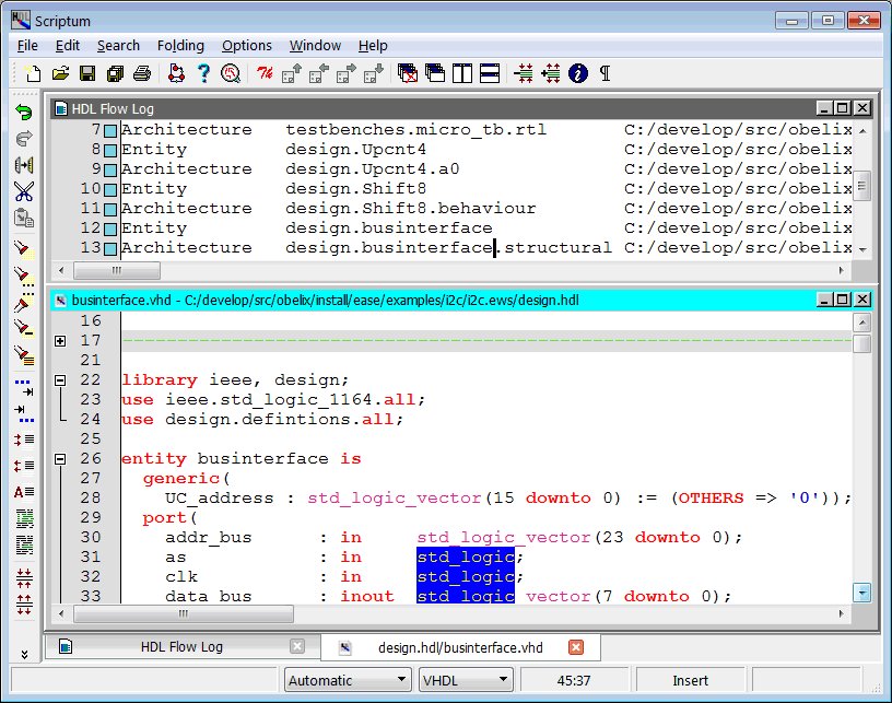 EASE comes complete with its own integrated HDL language editor, Scriptum. Even on extremely large files Scriptum offers exceptionally fast editing capabilities. You can avoid typing errors and dramatically improve your productivity by using keyword and header templates, identifier repeat, auto case conversion and one-touch line and column manipulation. To keep your text highly readable and well structured, you may choose syntax coloring and in- and out-commenting of selected text, as well as line numbering and indentation. Scriptum offers extensive documentation capabilities such as color coding, capitalization and indentation to make your numerous lines of code more readable. Scriptum is fully customizable to create a design environment that meets your needs.