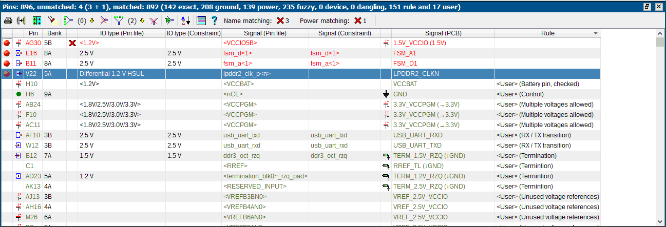 A severity is assigned to each line depending on the information extracted, defined rules and user interaction. Signals which have the same name in both FPGA and PCB environment are assumed correctly connected. Fuzzy matching can be used to ignore underscores and bus indicators in array names. Power pins should match by the voltage values (extracted from both pinlist and netlist). Ground pins should be connected to the ground plane.