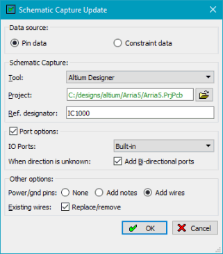 The schematic update interface allows you to add wires (and IO ports) to the symbols of an FPGA instantiated on different schematic pages based on the FPGA pin file, design constraints, or a CVS file. The interface can be used for both initial wiring of components or to update existing schematics because of changes in the pin assignments of the FPGA. For power and ground pins you can add a wire or place a note about the required voltage near the pin. The available options depend on the selected schematic capture system.